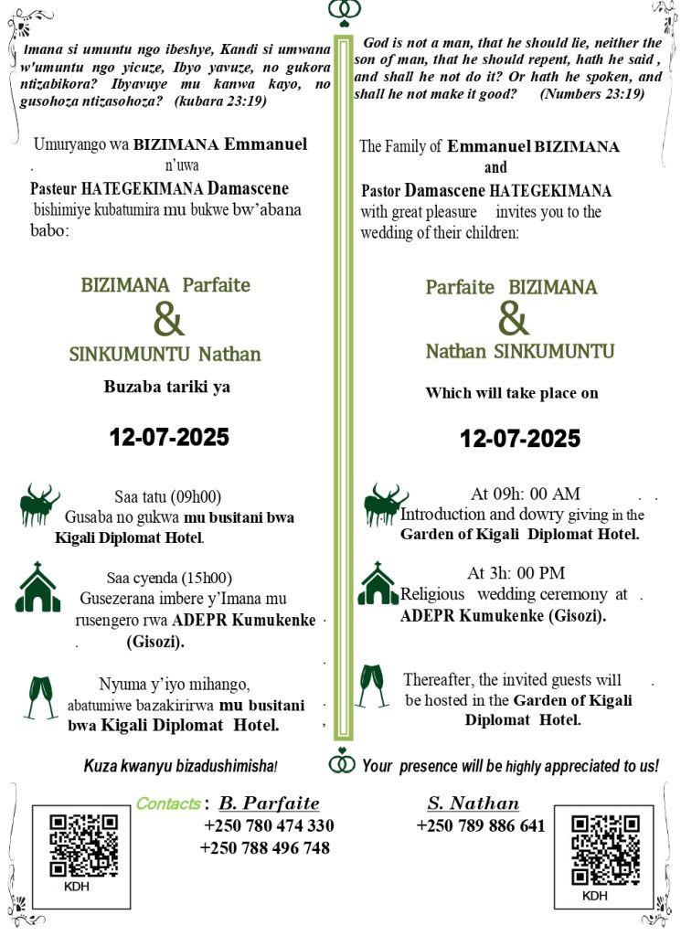 Imiryango yabo bombi, yaba uwa Bizimana Emmanuel (Papa w’umukobwa) ndetse n’uwa Pasteur Hategekimana Damascène (Papa w’umusore), yatangaje ku mugaragaro ko yishimiye gutumira abantu mu birori by’ubukwe, ku rugo rushya ruzashingwa ku wa Gatandatu, tariki ya 12 Nyakanga 2025.